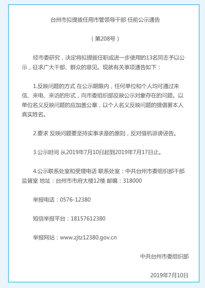 7月11日的《台州日报》,发布了台州市拟提拔任用13名市管领导干部的任前公示通告。