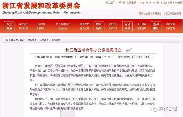 重磅!长三角区域合作办公室正式成立 嘉兴如何作为?
