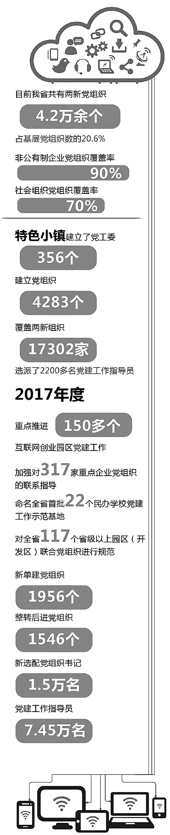 在两新党建工作中,我省根据自身特点,坚持创新突破,在特色小镇、园区(集聚区)、互联网业、民办学校等新领域新业态,积极探索、创新推进,有效覆盖水平明显提升。
