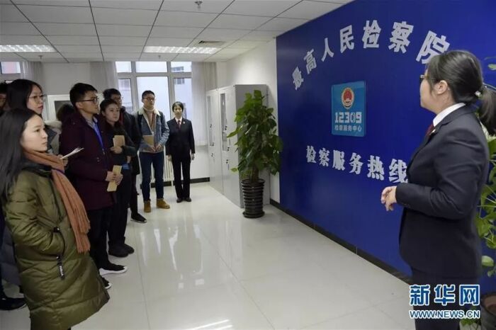 2018年12月4日是国家宪法日,最高人民检察院机关举行第26次检察开放日活动,这是参加开放日活动的代表在参观12309检察服务中心。新华社发