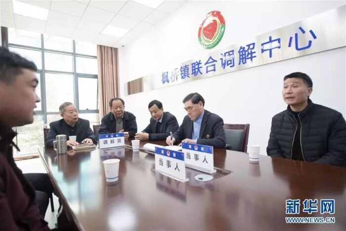 4月1日,在浙江省诸暨市枫桥镇联合调解中心,工作人员在调解一起合资纠纷。翁忻旸 摄