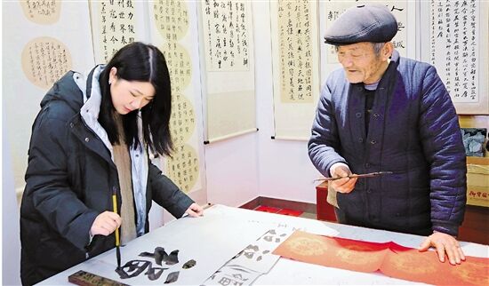 还没迈进书法创作室,先闻到浓浓墨香。屋子里站满了人,地上晾着一幅幅刚写好的大红春联。只见七八位头发花白的老大爷围在一张大木桌子前挥毫泼墨。“胡老师,给我写一幅!”“钱老师,我横批还没有!”村民喜气洋洋的“订单”接踵而至。
