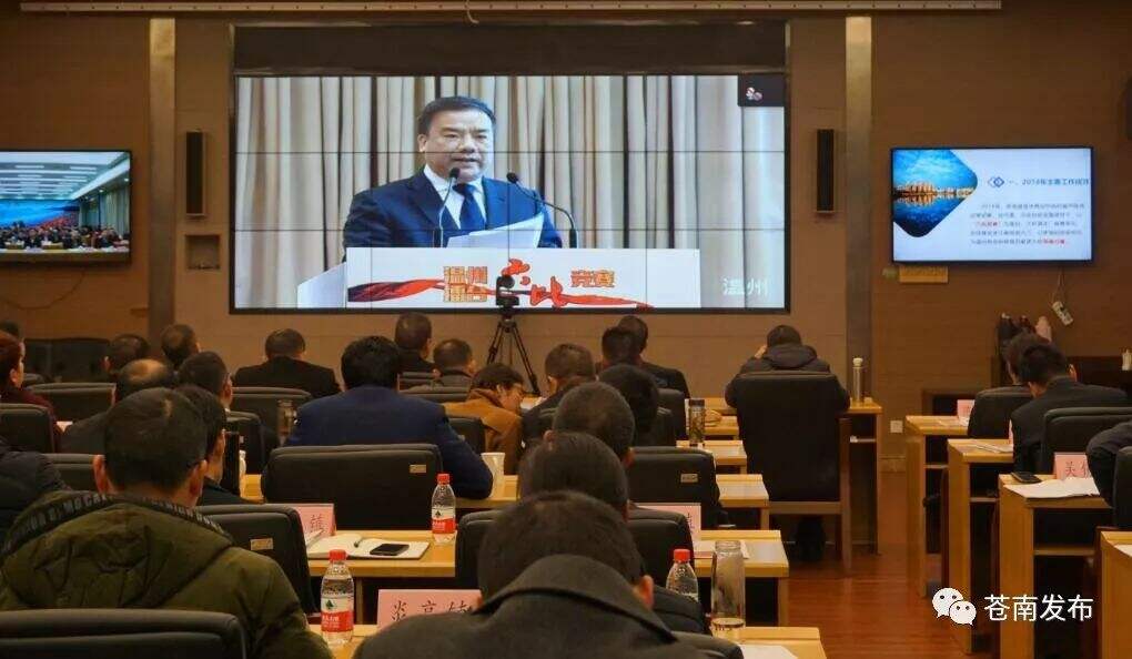 苍南县委书记黄荣定在温州主会场代表苍南秀出2018年“成绩单”,晒出2019实干路线“作战图”,向全市人民报告!县长郑建忠、县人大常委会主任黄锦耀、县政协主席陈国苗、县委副书记胡长虹等县四套班子领导分别在温州主会场和苍南分会场参加会议。