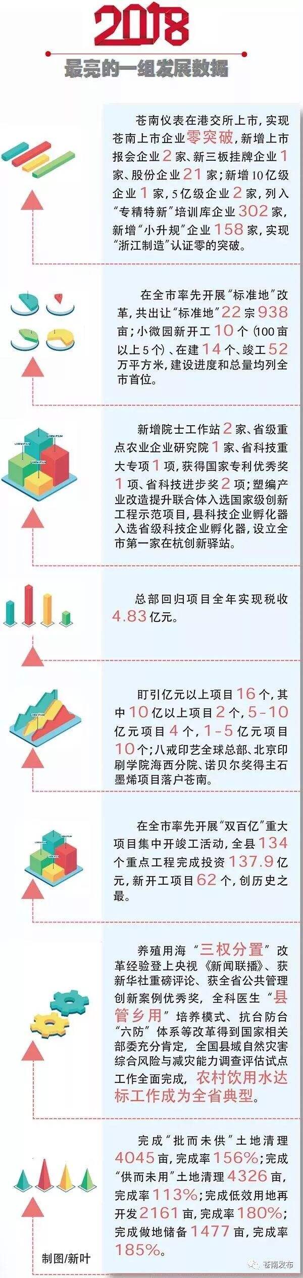 新年新起点,踏上征程再出发。2019年,苍南县将以“铸铁军、比担当、抓落实”为工作主题,以深化“十招破十难”专项行动为抓手,以党政机构改革为契机,以责任捆绑攻坚机制为保障,将忠诚干净和“六比竞赛”贯穿于全过程,着力铸就全面过硬的苍南铁军。将以中央和省市县部署的重点工作为赛场,搭建更加强有力的比拼擂台,培育竞争开放的工作文化,全面营造争先创优、勇立 潮头的浓厚氛围,特别要持续深化“三服务”活动,更大力度推进“小升规”和企业上市,力争规上工业增加值进位全市前列,成为“两个健康”先行区建设排头兵。苍南还将进一步强化项目为王、大干快上,全面融入温州发展大战略,全面掀起大建设大投入大发展新高潮,加快高质量建设“浙江美丽南大门”,以更强的使命担当为温州再创新辉煌贡献更大的苍南力量。