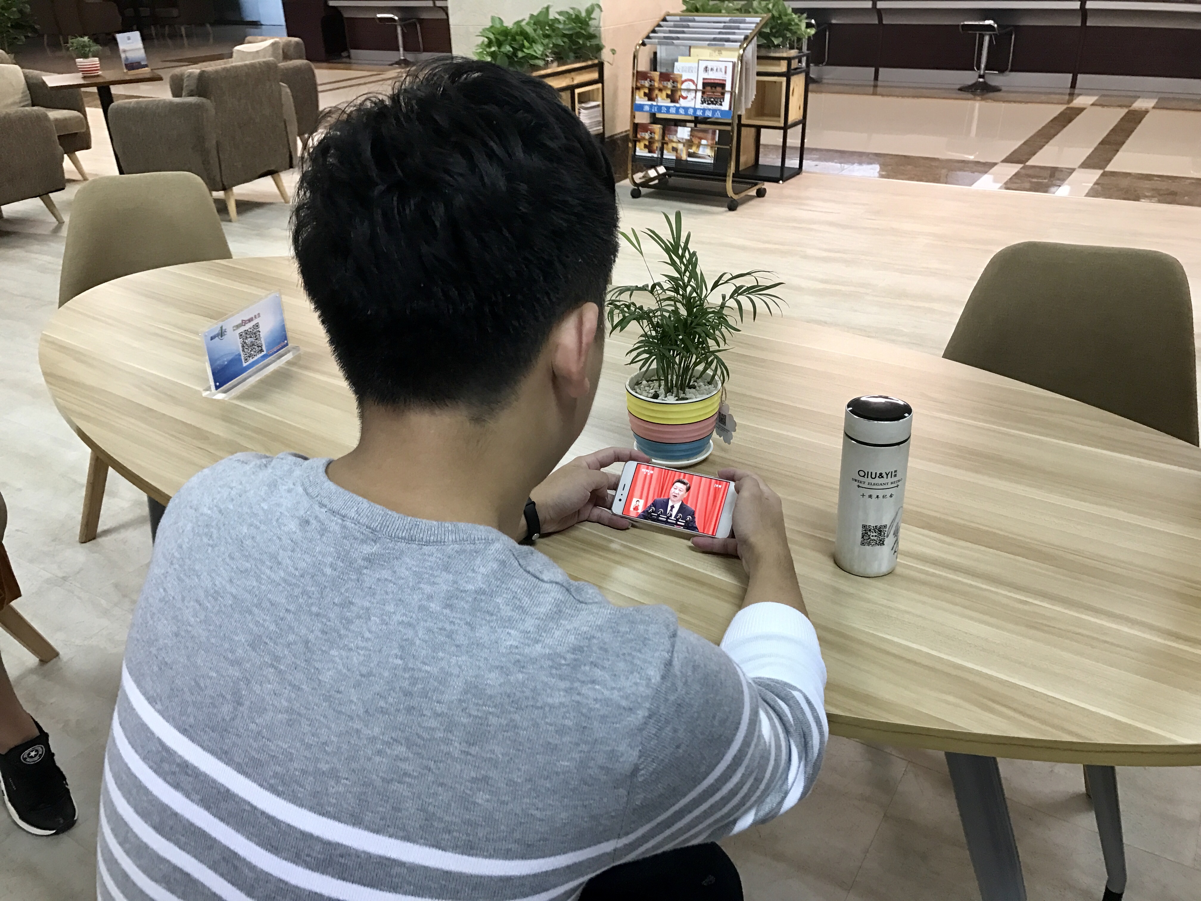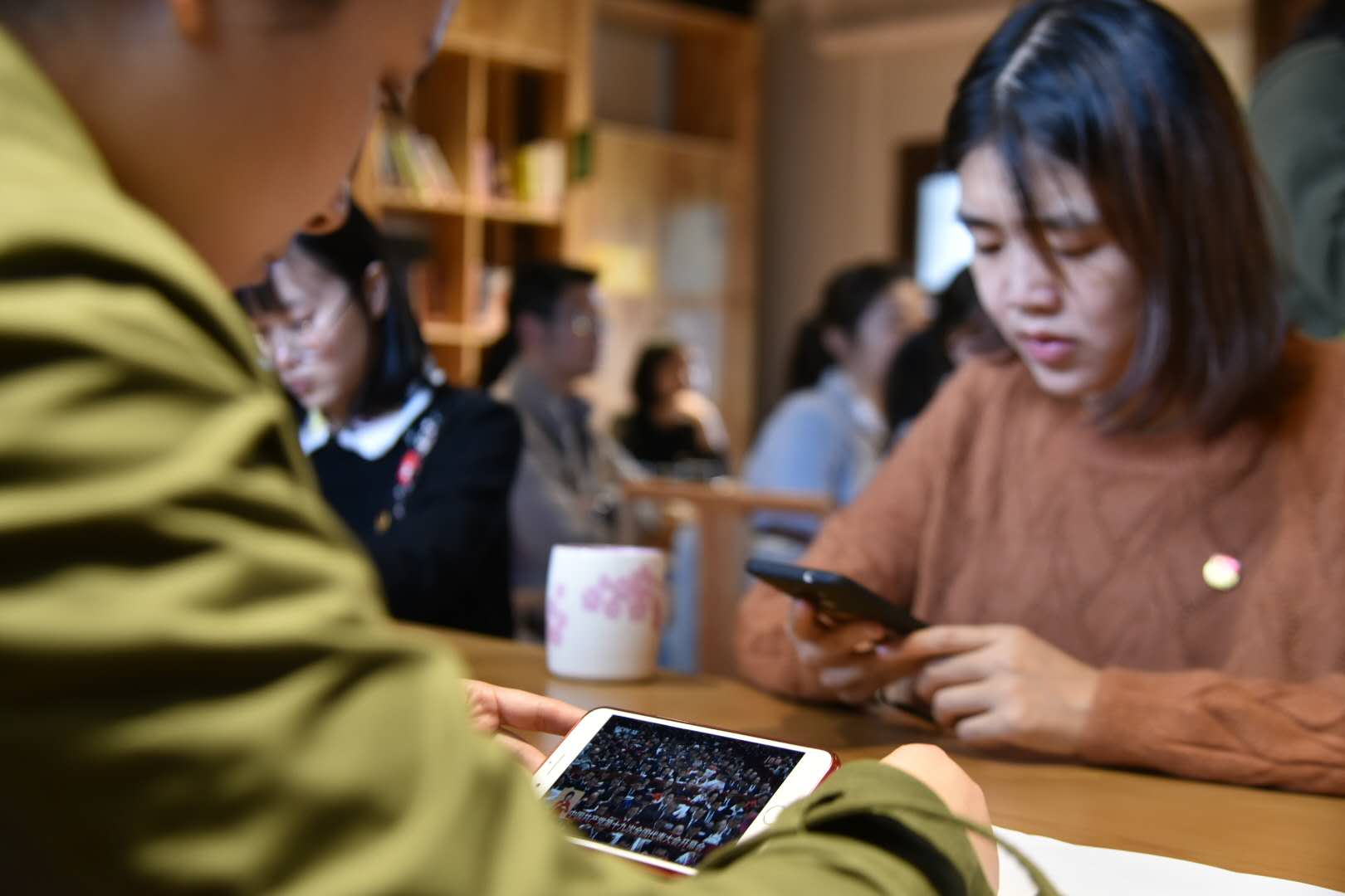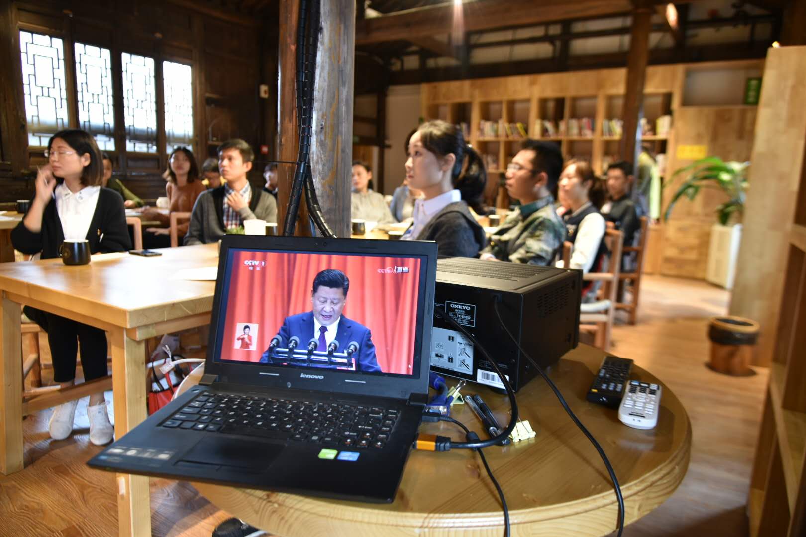 10月18日上午,衢州市区水亭门历史文化街区的24小时书房内,余承知和童萍通过浙江新闻客户端收看十九大开幕。