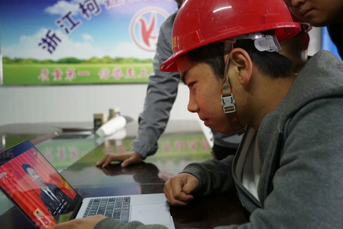 衢州市第三实验学校施工单位的青年工人们通过电脑收看十九大开幕会。