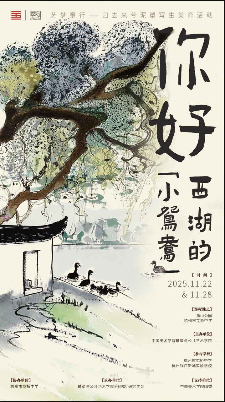 这个初冬,西湖后孤山的水面被一群孩子的惊叹声唤醒。粼粼波光间,毛茸茸的小鸳鸯成群游过,而岸边的笕桥中学学生正举起相机、铺开画纸,将这份灵动定格为永恒——这不是普通写生课,而是笕桥中学“艺梦童行”品牌下的一场跨学科美育实践,更是一场连接艺术、生态与社区的生命教育。