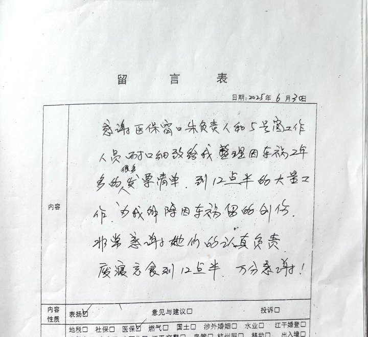 为了感谢窗口工作人员的耐心帮助,也为了表达对杭州医保政策的由衷认可,老张专程又来到市民中心,郑重地留下一封感谢信。信上只有短短一句话:“杭州医保的服务很好,全国领先!”寥寥数字,却字字透着温度,也映照出杭州医保背后那份坚实而温暖的保障体系。