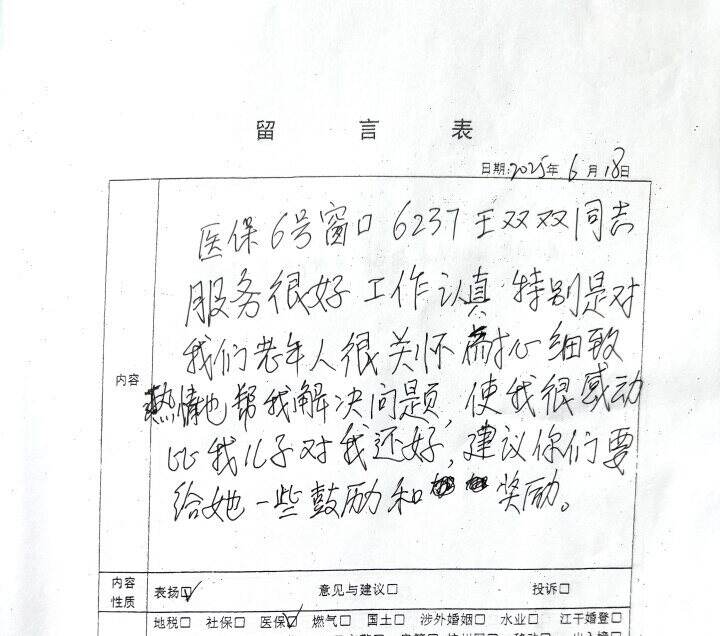“6237王双双同志,让我不要急,还给我倒了杯茶。她真的服务很好、工作认真,特别是对我们老年人很关怀,耐心细致热情地帮我解决了问题,贴心程度已经超过我儿子了!”钱大伯苦恼已久的问题很快得到了解决。