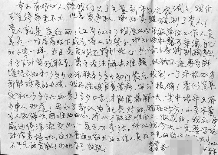 “看似简单,实际花了多少心血、费了多少口舌,才能圆满解决。这是小吴本着为人民解决困难的心,才能迎难而上做成的,我一定要写这封信表扬她,这位普通又敬业的工作人员在平凡的岗位上做出了不平凡的贡献。向她学习!”张奶奶在信里动容地写道。上周,两位老人来杭州市政务服务中心办理其他事务,还不忘来医保窗口感谢。