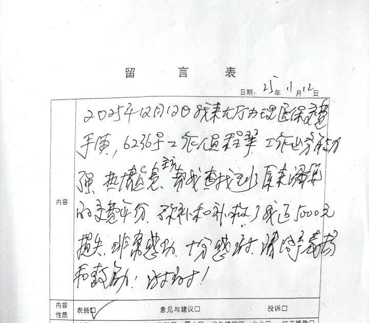 潘先生在感谢信里写道,“医保窗口的工作人员业务能力强、热情负责、非常细致,我非常感动,十分感谢!”