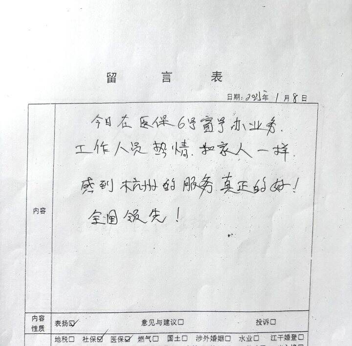 同样让人印象深刻的,是一对从上海退休后来杭安家的夫妇手写的满满一张A4纸的感谢信。来杭后,两位老人的社保卡不慎丢失,异地医保没法使用。张奶奶有肠癌病史,回杭天气变冷,加上旅途劳顿,张奶奶突发面瘫,还伴三叉神经痛,老人的医保不能使用、没法看病。绝望之际,他们想到去杭州医保窗口咨询求助。当天在咨询窗口的工作人员吴红丽热心地接待了两位老人,千方百计地为两位老人想办法,几次联络上海医保后终于找到一个方式:在杭看病,回上海报销。