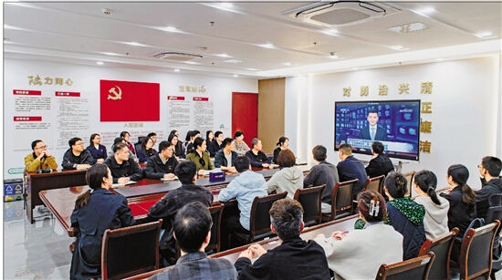 4月23日,金华市国际陆港产业发展有限公司职工在收看《新闻联播》。通讯员 胡肖飞 摄