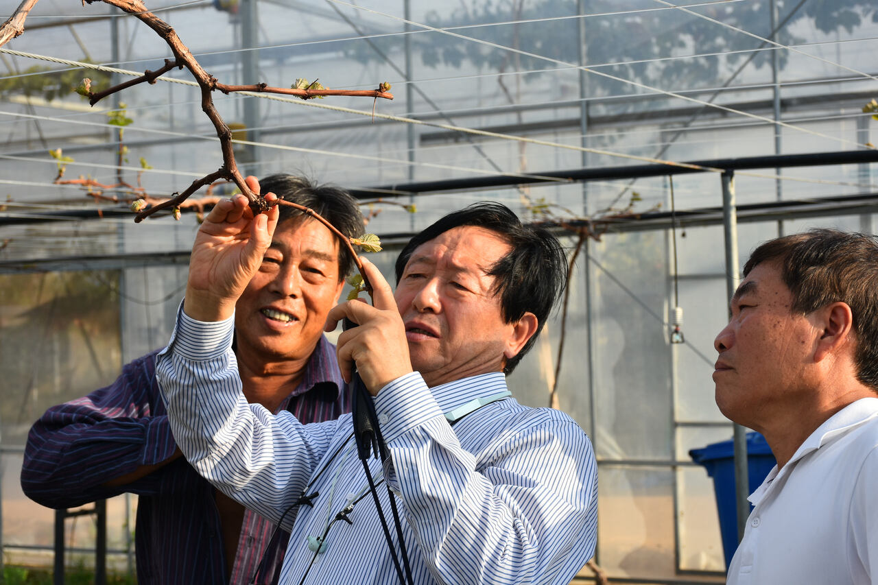 上海交通大学王世平教授(左二)在黄宅镇横山村智慧农业大棚内指导葡萄种植技术/金华市浦江县委组织部 供图